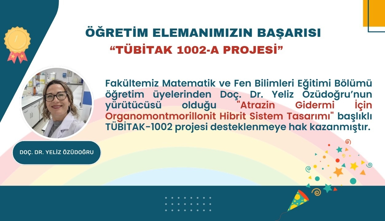 Fakültemiz Matematik ve Fen Bilimleri Eğitimi Bölümü öğretim üyelerinden Doç. Dr. Yeliz Özüdoğru’nun yürütücüsü olduğu "Atrazin Gidermi İçin Organomontmorillonit Hibrit Sistem Tasarımı" başlıklı TÜBİTAK-1002 projesi desteklenmeye hak kazanmıştır.