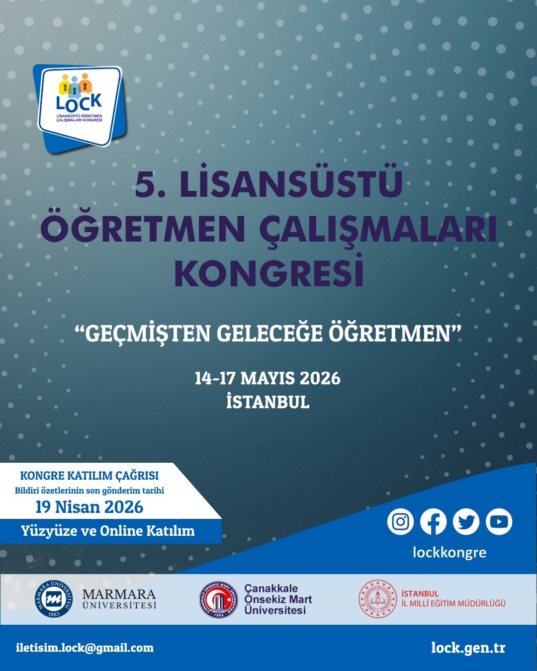 Beşincisi gerçekleştirilecek olan ve geleneksel hale gelmesi hedeflenen Lisansüstü Öğretmen Çalışmaları Kongresi’nin (LOCK) katılımcılar için yararlı olmasını ve yeni yüzyılın gereksinimlerinin ele alındığı çalışmaların gerçekleştirildiği bir paylaşım ortamı olmasını dileriz. Sizleri değerli fikirlerinizle geleceğin eğitimine yön vermek üzere aramızda görmekten mutluluk duyarız.