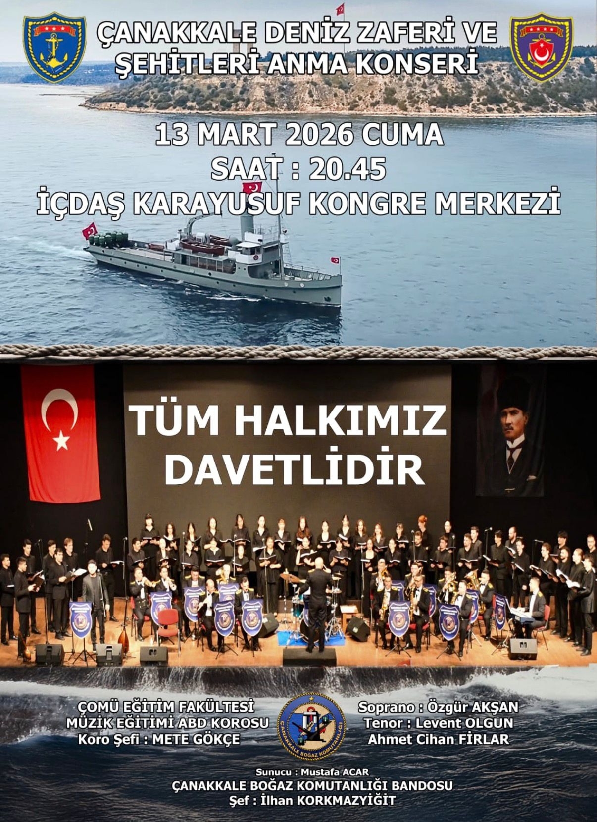 ÇOMÜ Eğitim Fakültesi Müzik Eğitimi ABD Korosu ve Çanakkale Boğaz Komutanlığı Bandosu’nun ortaklaşa gerçekleştireceği konsere tüm akademik, idari personelimiz ve değerli halkımız davetlidir.