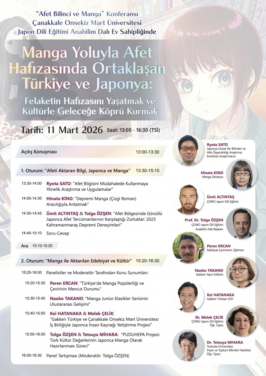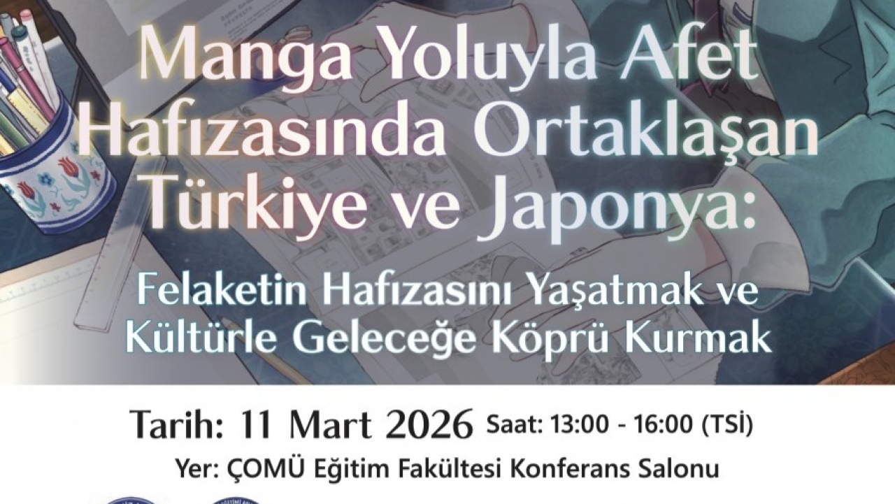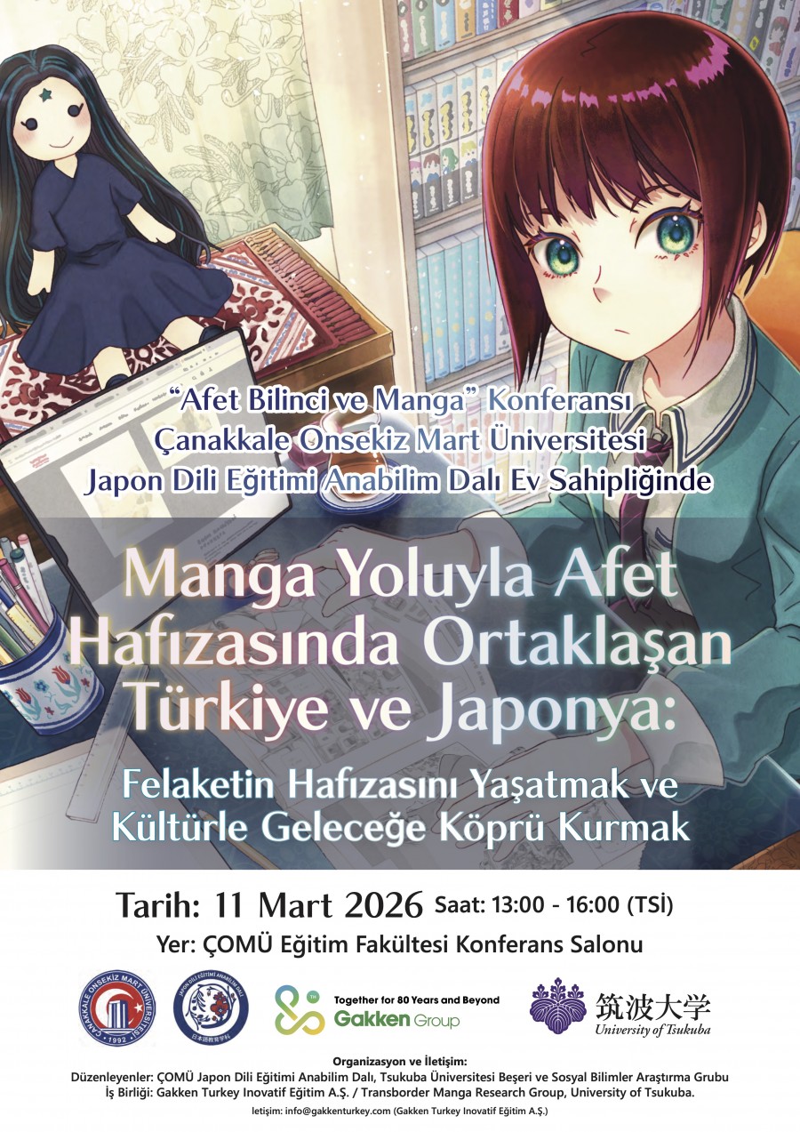 Çanakkale Onsekiz Mart Üniversitesi (ÇOMÜ) Eğitim Fakültesi Japon Dili Eğitimi Anabilim Dalı ile Japonya’nın saygın üniversitelerinden Tsukuba Üniversitesi Beşeri ve Sosyal Bilimler Araştırma Grubu iş birliğinde düzenlenen “Manga Yoluyla Afet Hafızasında Ortaklaşan Türkiye ve Japonya” başlıklı uluslararası konferans, 11 Mart 2026 tarihinde gerçekleştirilecektir.